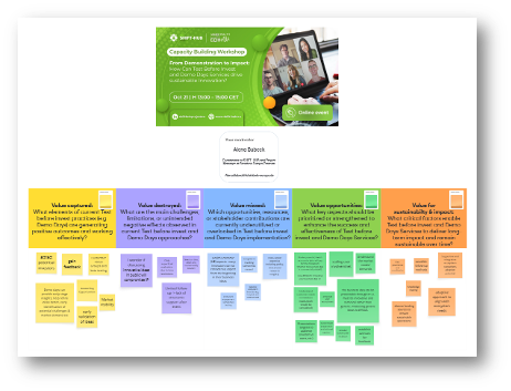 The aim of the value mapping was to identify and analyse the five key values in applying Test before Invest and Demo Days methodologies: values captured, destroyed, missed, opportunities, and value for impact and sustainability. In order to do so, each value was tackled by answering a critical question in smaller working groups. This structured yet open approach encouraged meaningful dialogue, idea generation, and exchange of best practices. The outcome was a consolidated set of insights, recommendations, and service enhancements that can strengthen the Test before Invest landscape. The key findings are summarised in the following.